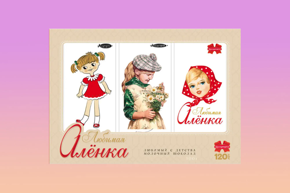К юбилею фабрика также сделала подарочный ретронабор шоколада "Любимая Аленка". В нем три шоколадки по 100 грамм. По этикеткам из разных эпох можно проследить, как менялась упаковка сладости.