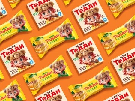 Кроха Тедди получился забавным ребенком в шапочке с медвежьими ушками, похожим на известного персонажа сказок. В дизайне упаковки использованы "кондитерские коды": яркий и контрастный бренд-блок, "кондитерские" цвета: красные, коричневые, охристые оттенки. Не обошлось и без помощи искусственного интеллекта.