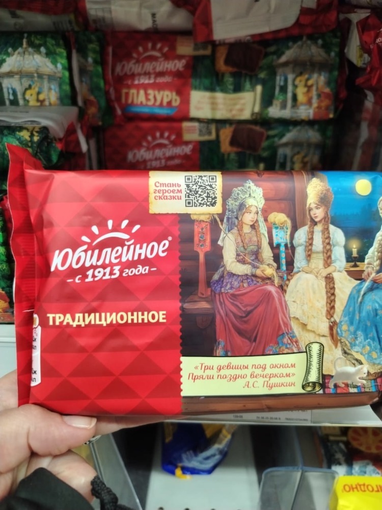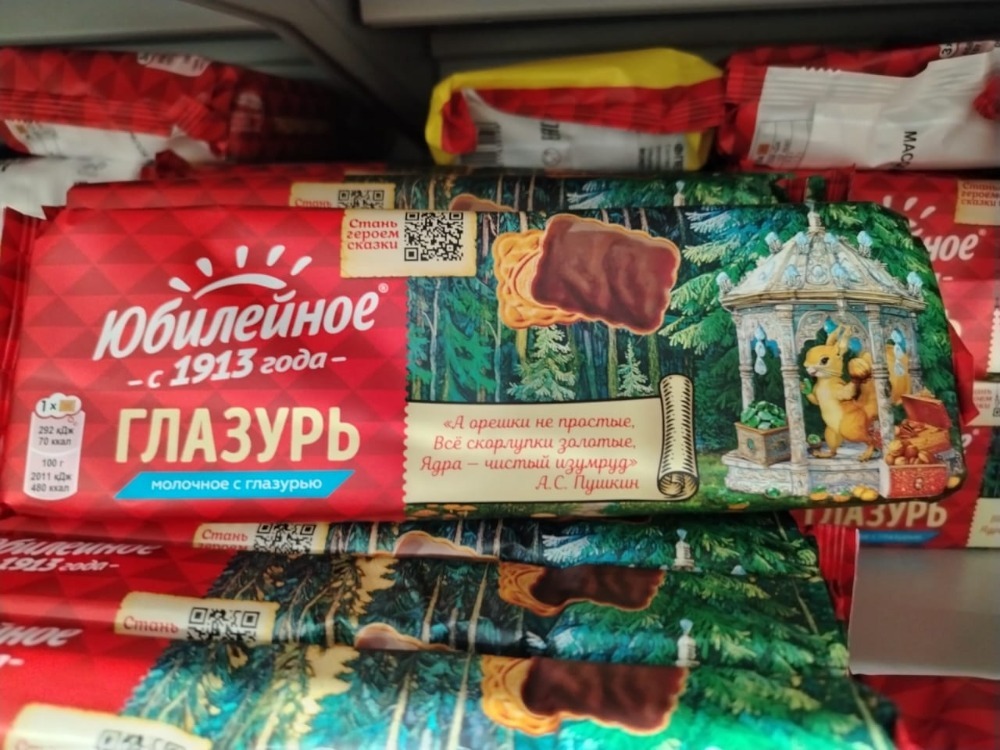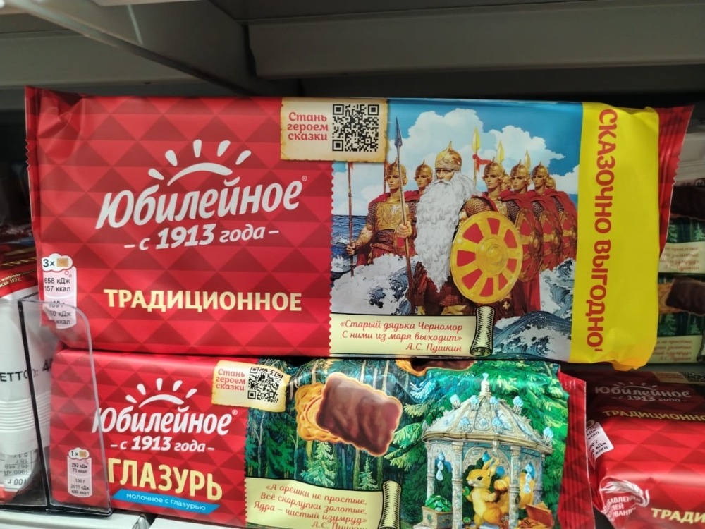 В Рязани в сети магазинов "Магнит" продаётся печенье "Юбилейное" в лимитированных упаковках по мотивам сказок Александра Пушкина. В магазине на площади Театральной можно купить печенье в упаковках с иллюстрациями к произведениям "Сказка о царе Салтане, о сыне его славном и могучем богатыре князе Гвидоне Салтановиче и о прекрасной царевне Лебеди" и "Сказка о рыбаке и рыбке".