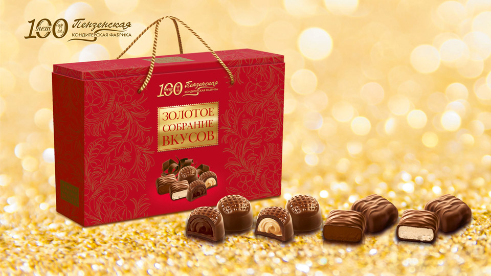 «Пензенская кондитерская фабрика» выпустила лимитированный набор конфет «Золотое собрание вкусов» в честь 100-летия успешной работы. В коробке представлено ассорти популярных видов шоколадных конфет.