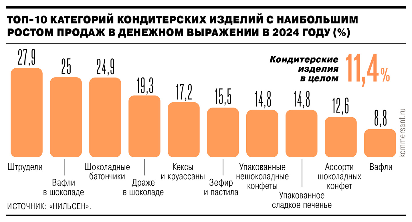 Несмотря на возникшие у производителей сложности, потребительский спрос на сладости продолжает расти. В аналитической компании «Нильсен» отмечают, что продажи кондитерских изделий в целом по итогам прошлого года выросли на 1,7% в натуральном выражении и на 11,4% в деньгах. В исследовательской компании NTech отмечают рост спроса в натуральном выражении на 6,4%. Самое заметное увеличение показали зефир (на 21,9% год к году) и шоколадное драже (на 15,9%).