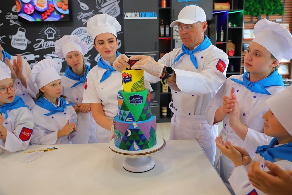 Генеральная репетиция приготовления кондитерского чуда прошла в студии столовой комплекса "Горный". Ребят одели в поварские кители, колпаки, голубые галстуки и разделились на команды. Одни готовили шоколадный бисквит, другие - ванильный. Все участники, включая шеф-кондитера, показали высокий класс умения обращаться с блендерами и другим кондитерским оборудованием, а также знание секретов высокой кухни. В итоге десятикилограммовый торт получилось приготовить за полтора часа.