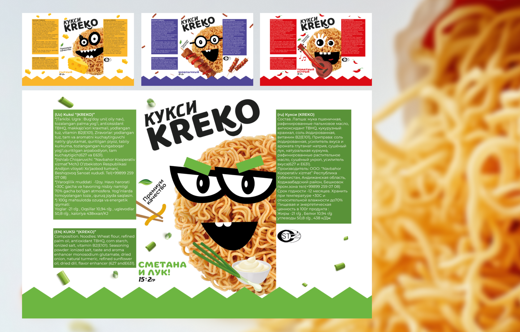 Студия дизайна Rus2 Design разработала упаковку для лапши быстрого приготовления Kuksi Kreko (Узбекистан). Бренд стремится выделиться благодаря смелым вкусам и удобству.
