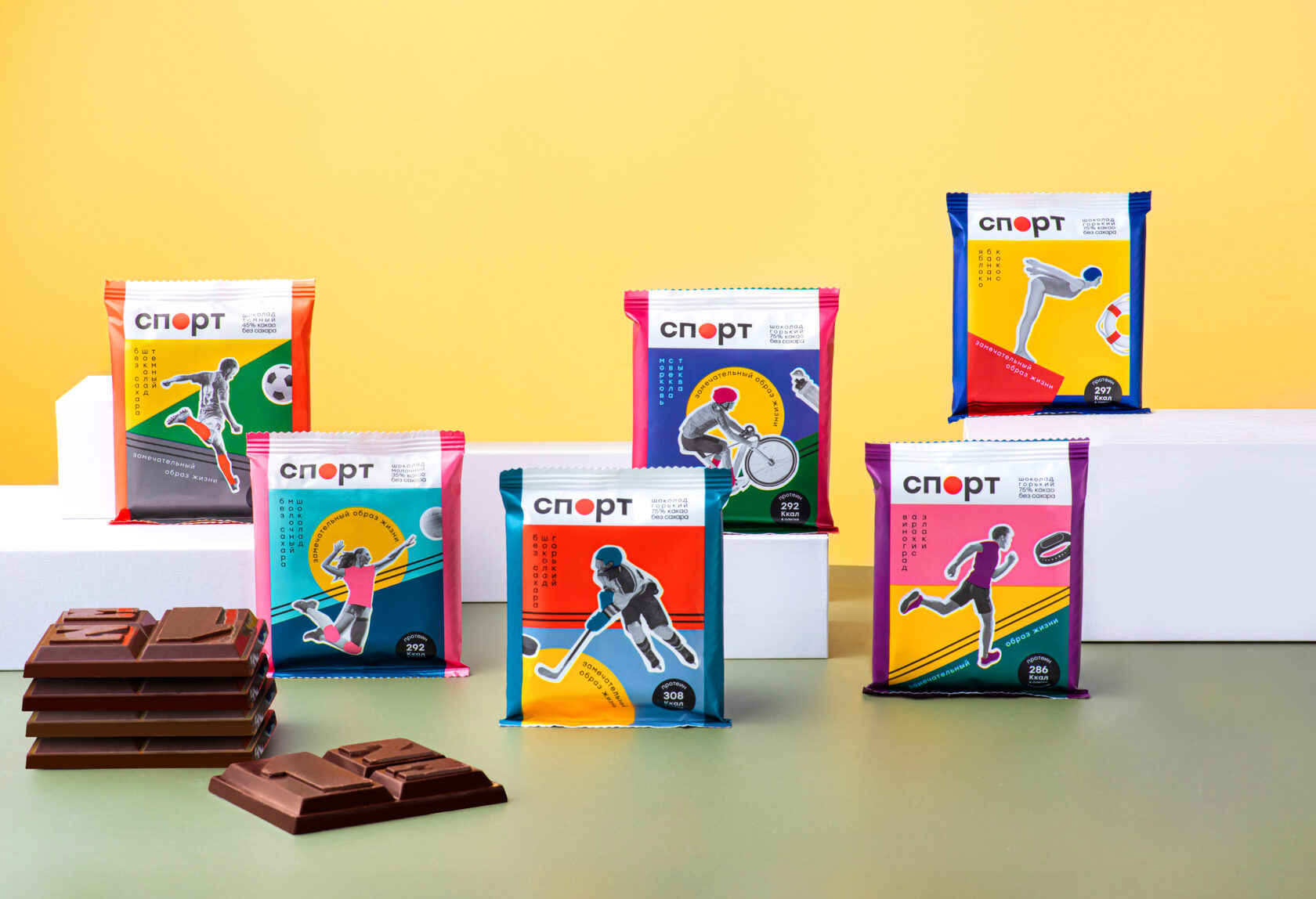 Особое внимание заслуживает линейка шоколада "Спорт" — протеиновый шоколад без сахара, разработанный для спортсменов и тех, кто следит за здоровьем. Уникальная форма плитки в виде спортивного пьедестала символизирует стремление к победе. Ассортимент включает варианты с добавлением фруктов, овощей и злаков, посвященные различным видам спорта — хоккею, футболу, плаванию, бегу и велоспорту.